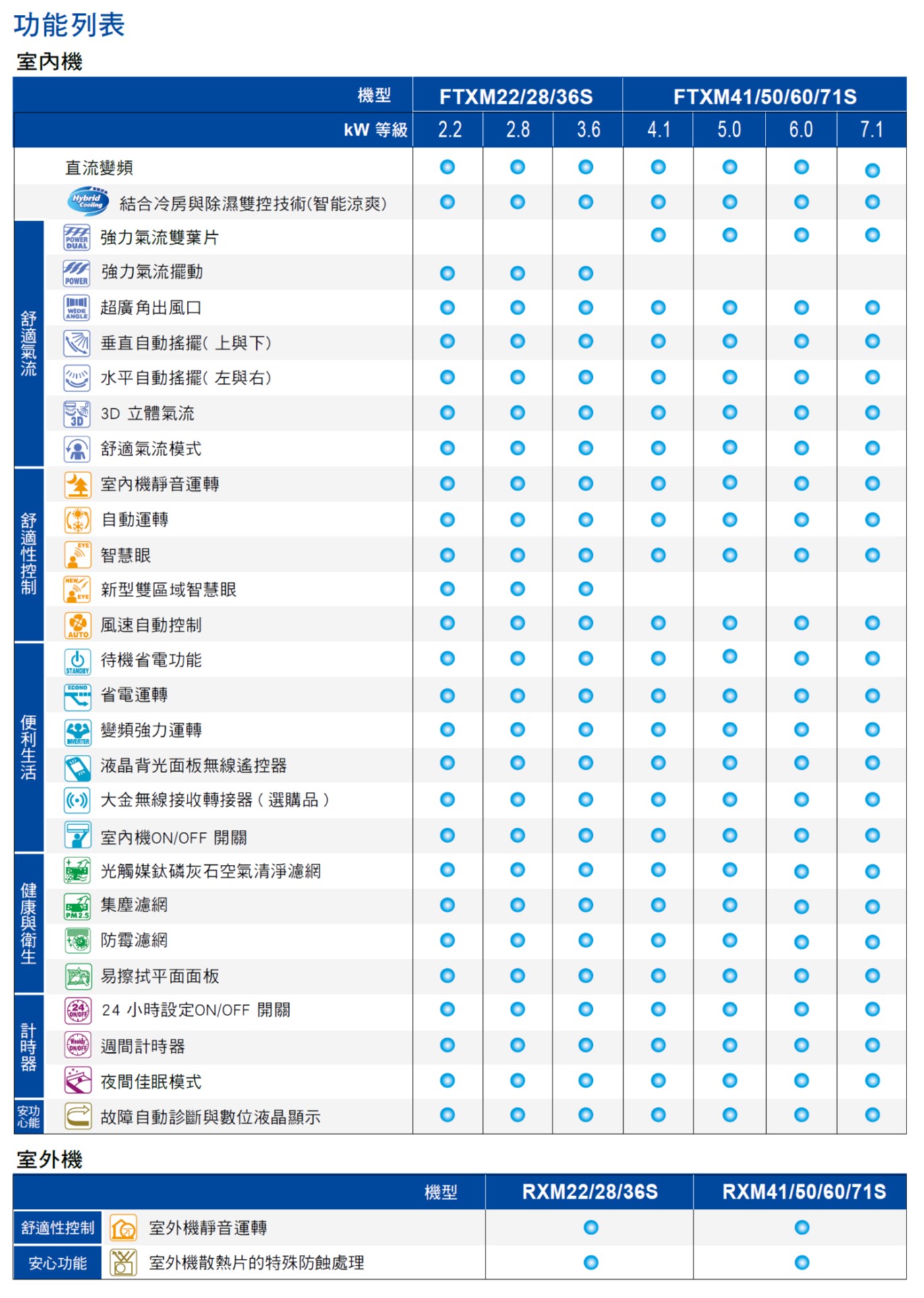 由於變頻空調達到設定溫度後,通常會降低除濕性能和冷房能力。日本大金特別針對台灣氣候研發全新的橫綱FTXM-S系列可以改善此狀況。它保持恆溫除濕,讓您的居家永遠感覺清新和涼爽。